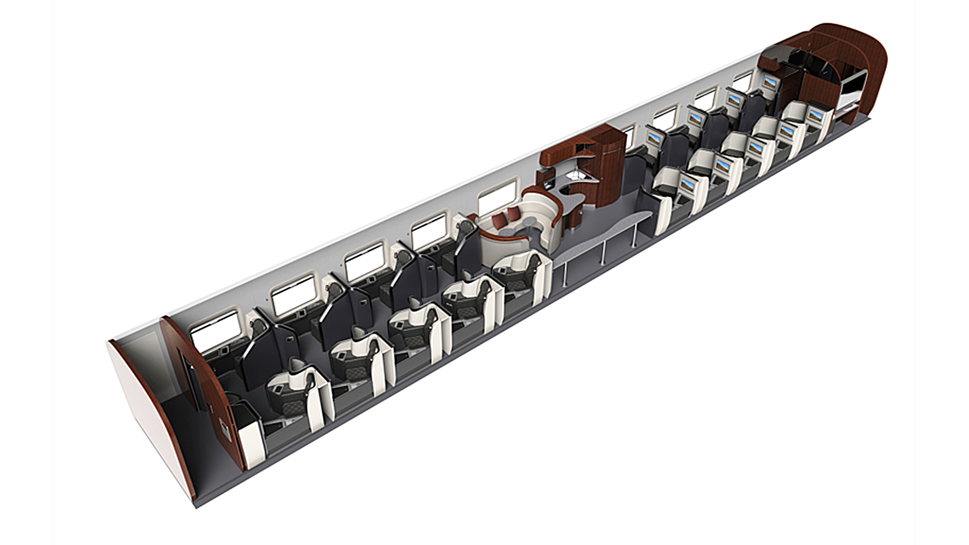 新設(shè)計(jì)按乘坐、用餐、乘務(wù)、洗手間、行李存放的功能劃分為5個(gè)區(qū)域,每個(gè)區(qū)域都配備了完整的功能設(shè)施。