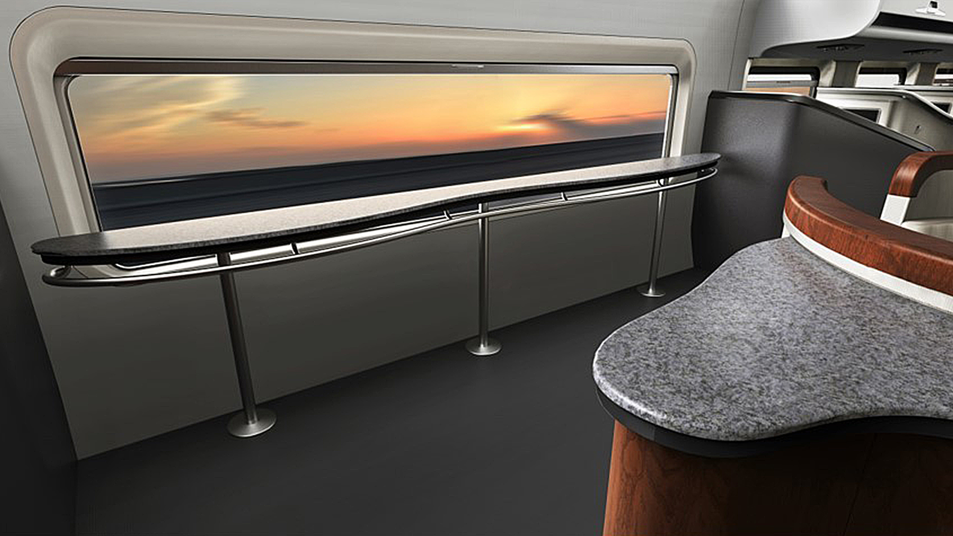 獨(dú)立的私人空間,科技感十足的乘坐休息區(qū)、全景觀景視窗、公共大空間會(huì)談區(qū),成為該方案的設(shè)計(jì)特色。每個(gè)位置都有對(duì)應(yīng)的大玻璃窗,可以方便的欣賞到窗外的景色,加之車廂內(nèi)的燈光效果,渲染浪漫星空,讓每次出行氛圍都成為一種享受!