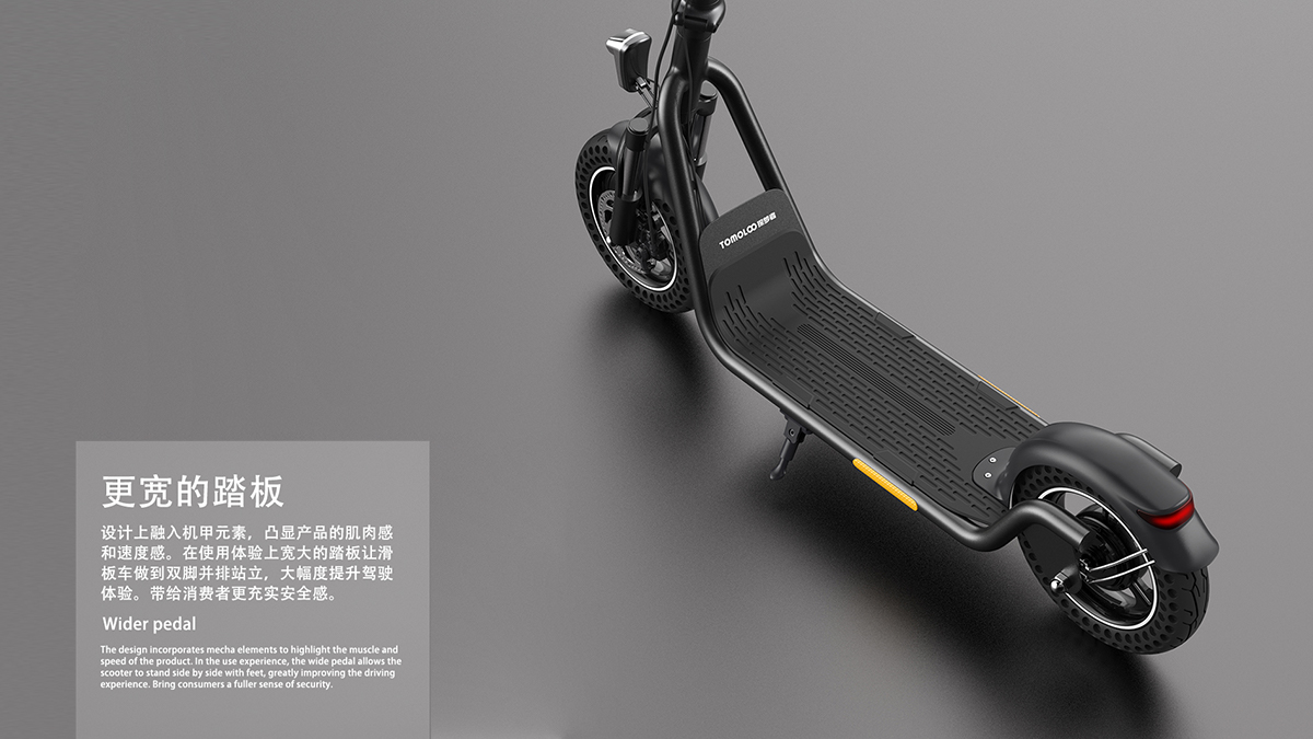 探夢者F2電動滑板車作為一款新型電動滑板車,在外觀上明顯區(qū)別于市場上絕大多數(shù)產(chǎn)品。采用更大輪胎和更大踏板,提煉摩托機車元素運用到這款電動滑板車的外觀設計中。在做到差異化的同時全面提升產(chǎn)品的安全性、實用性和使用體驗。