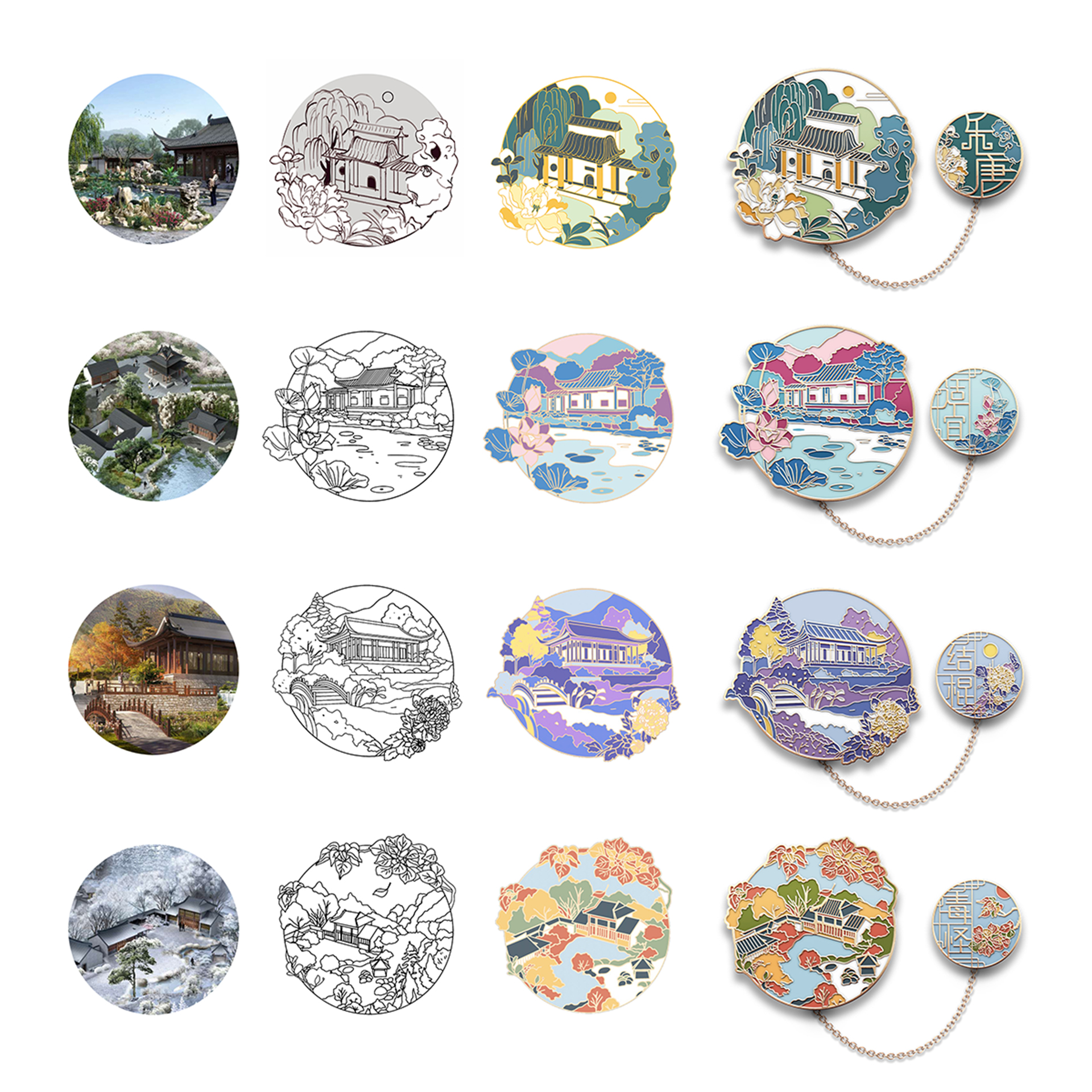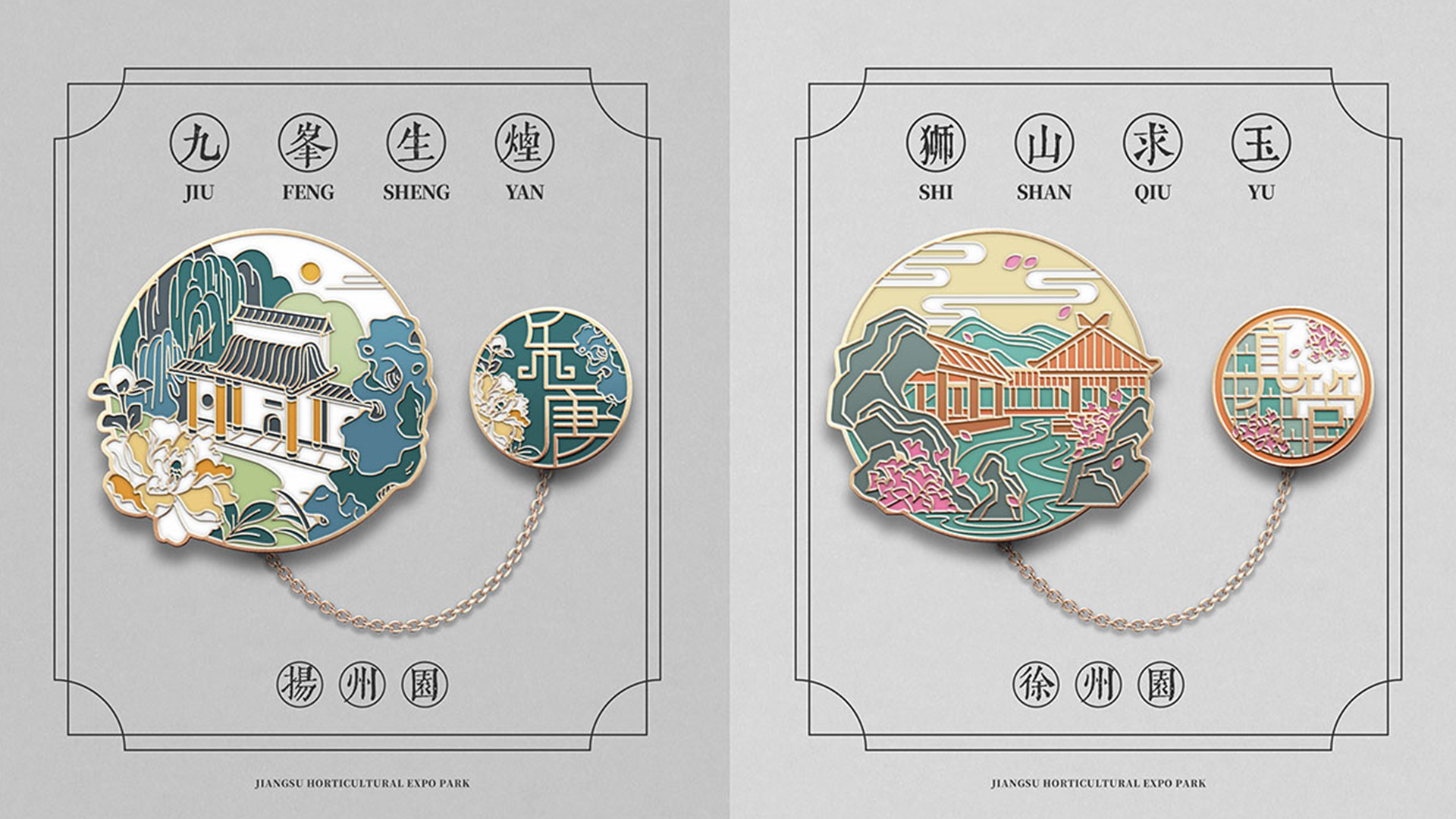 蘇韻薈谷·文創(chuàng)徽章:蘇韻薈谷徽章系列以江蘇省十三市經(jīng)典園林建筑為靈感,分別融入各地代表美好寓意的特色方言,從傳統(tǒng)園林窗花切入,運用視覺立體化手法,形成具有地方特色的徽章視覺體系。