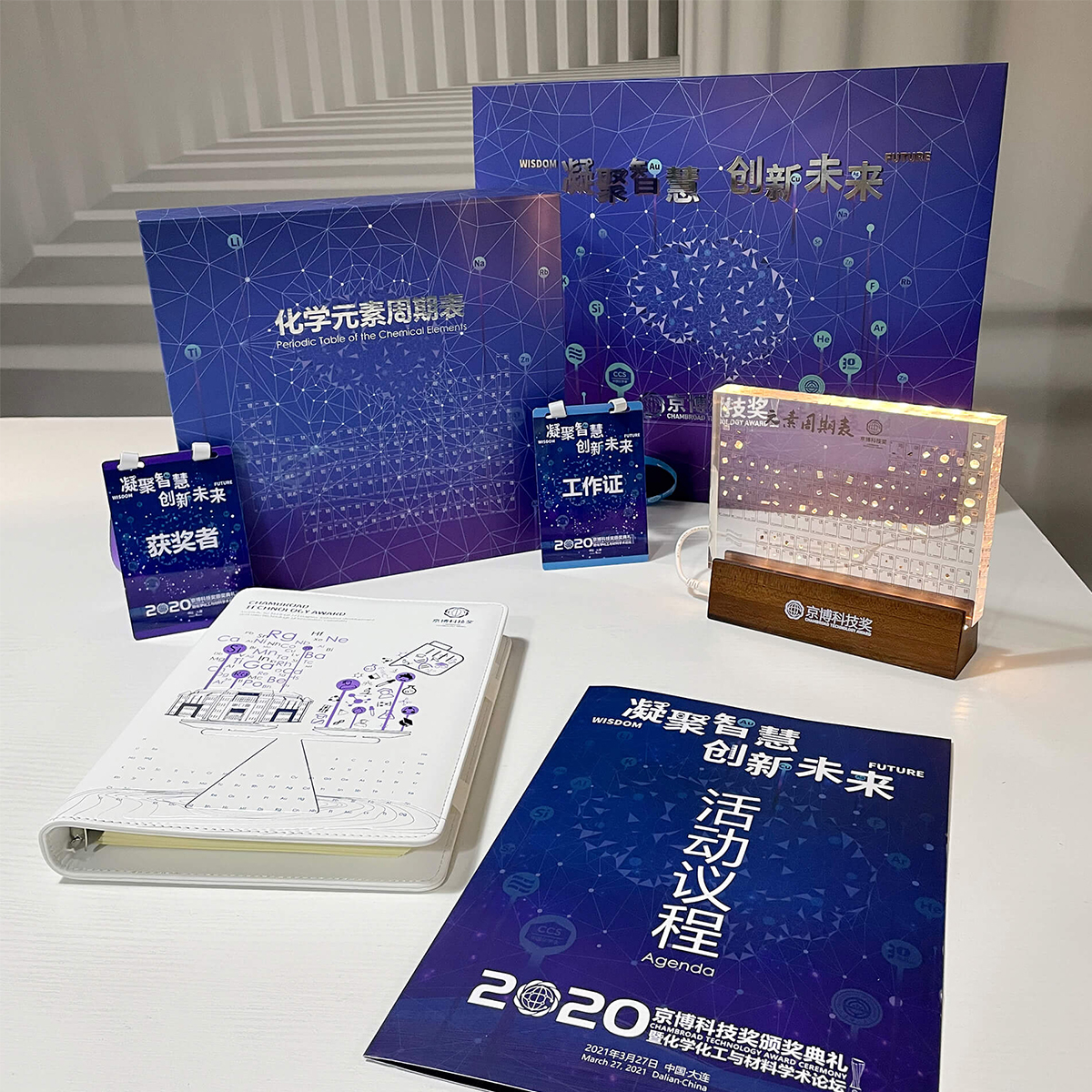 木馬設(shè)計(jì)北京負(fù)責(zé)了整場典禮的流程策劃、視覺設(shè)計(jì)、主KV設(shè)計(jì)、典禮PPT以及伴手禮設(shè)計(jì),并負(fù)責(zé)和參與了整個(gè)現(xiàn)場的布置工作。進(jìn)入會(huì)場,映入眼簾的是我們設(shè)計(jì)的舞臺(tái)視覺,以藍(lán)紫色為主,大屏幕上浮動(dòng)的元素與現(xiàn)場音樂配合,莊重而不失靈動(dòng),精致而不失大氣,給嘉賓良好的視覺聲覺體驗(yàn)。頒獎(jiǎng)典禮進(jìn)行中,舞臺(tái)的燈光隨現(xiàn)場氛圍而變,沉浸感十足。這場典禮凝聚了木馬設(shè)計(jì)北京所有小伙伴的心血與智慧,2020京博科技獎(jiǎng)?lì)C獎(jiǎng)典禮的圓滿結(jié)束,木馬設(shè)計(jì)北京不負(fù)眾望!