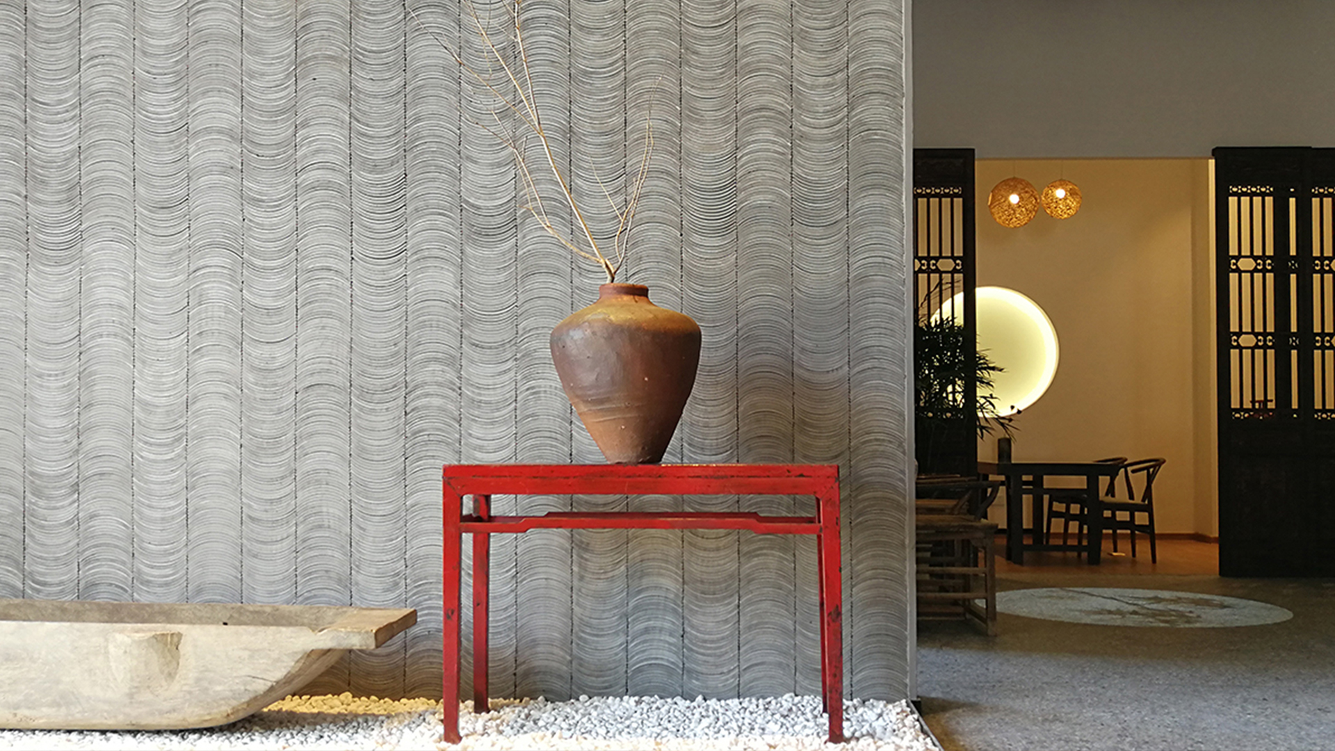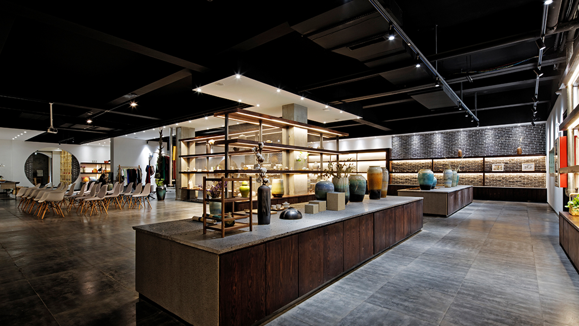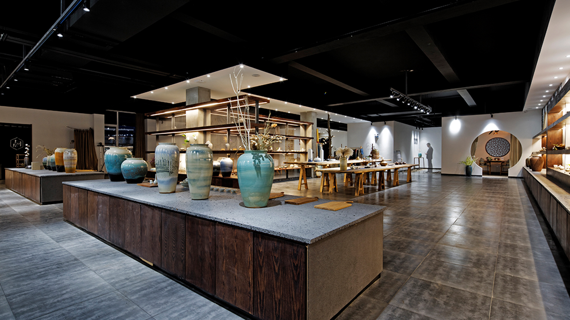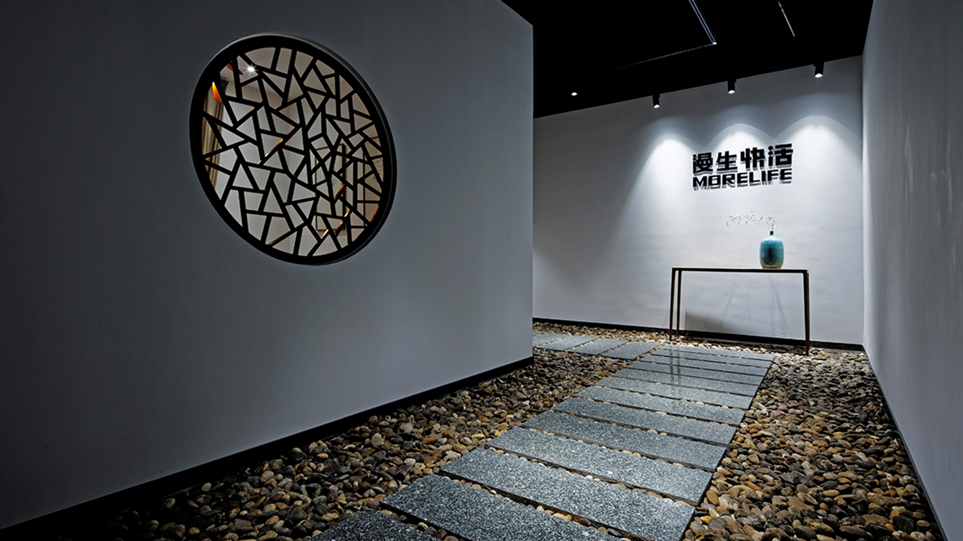 不爭論,不辯解,不過分堅持,讓本性自然釋放,也許有一天我們還會走向自己的反面。如果說平衡是世界的本來面貌,那么節(jié)制就是自我的修行。在欲望似乎沒有盡頭的今天,節(jié)制便顯得彌足珍貴。此項目運中江南園林中曲徑通幽之形,設(shè)計在方寸之間強化了藝術(shù)瓷器的雅致特別,進入后為一個集展示、零售、體驗及咖啡的綜合空間。一扇木門、一個櫥窗、一個景窗、一個圓形門廊,以多樣含蓄的方式與藝術(shù)對話。
