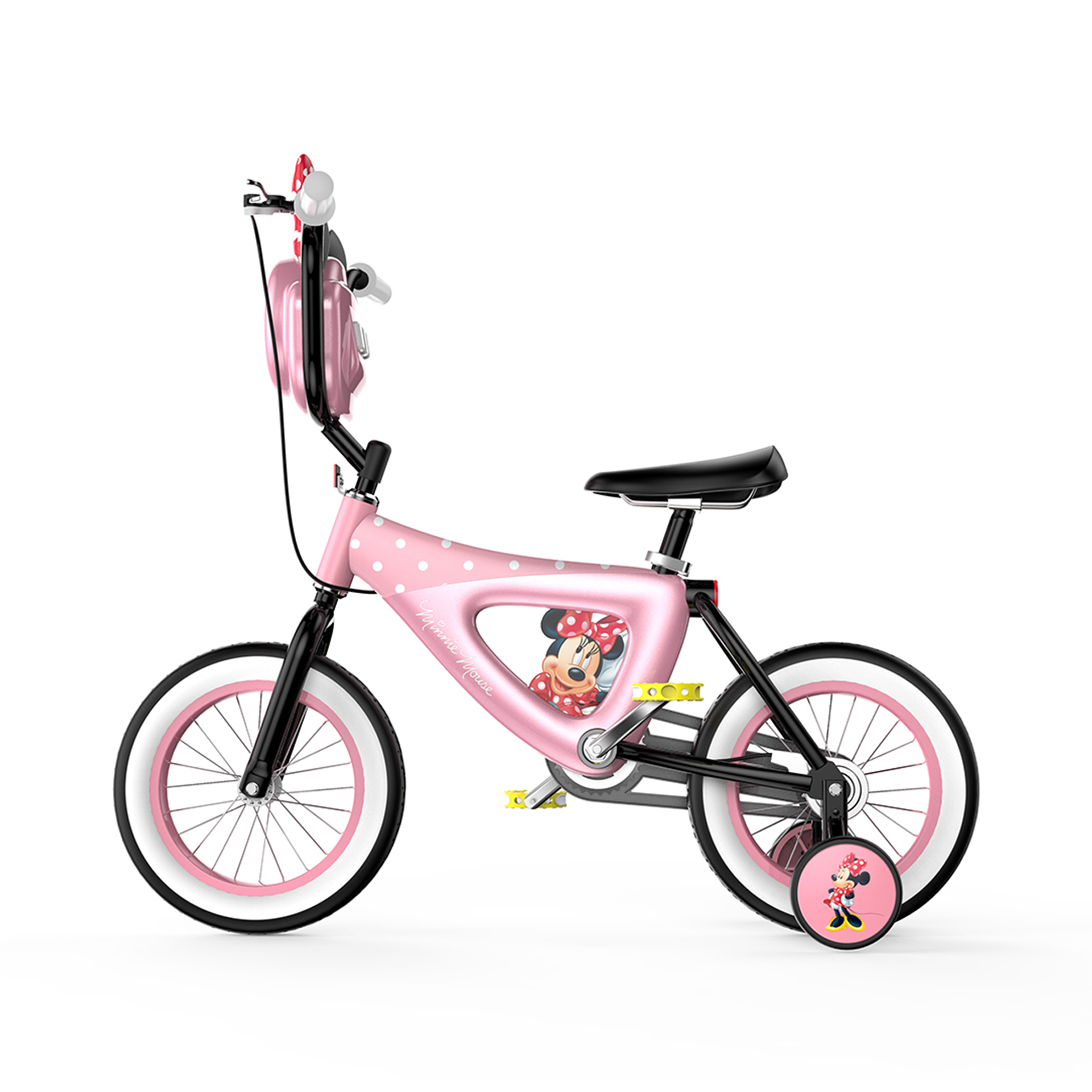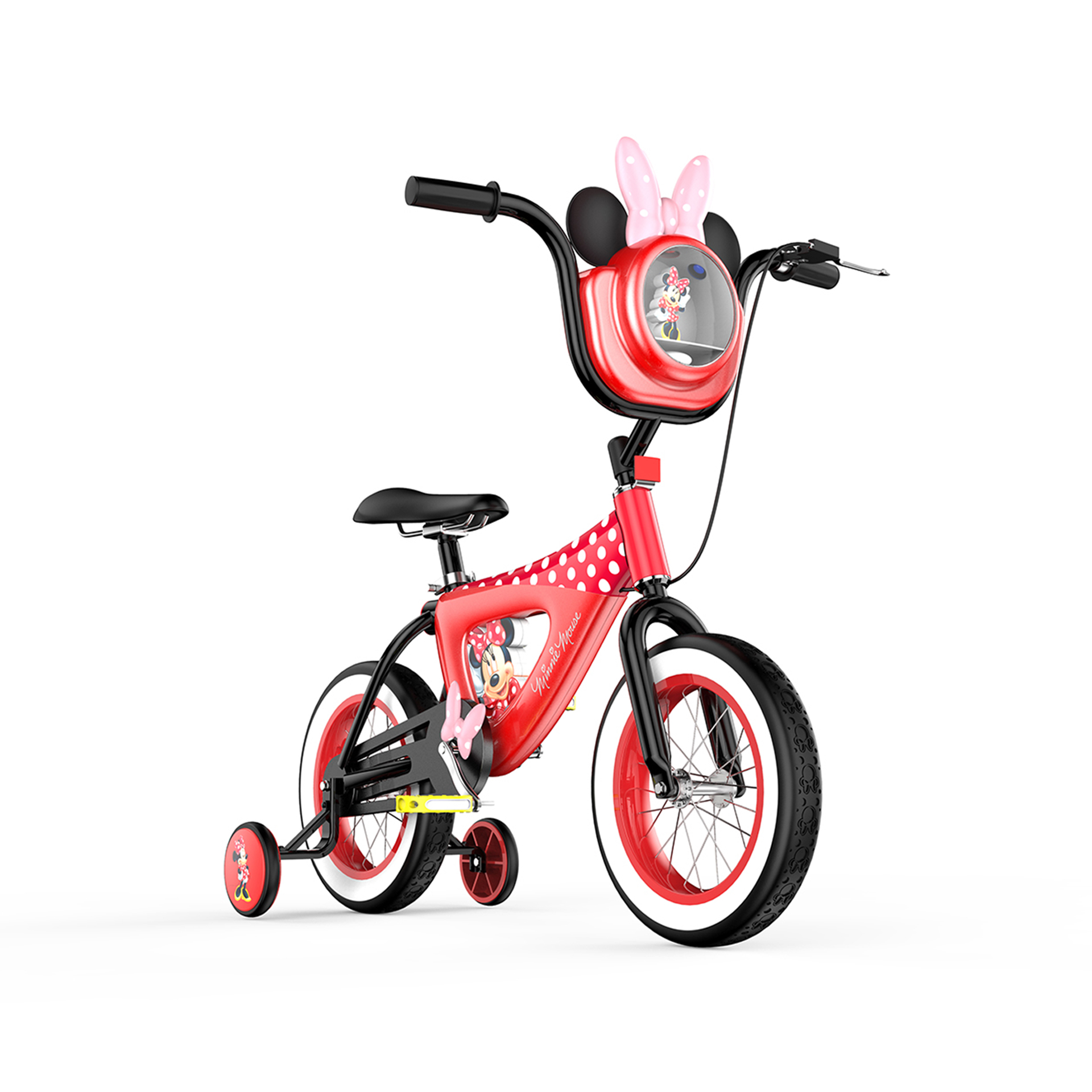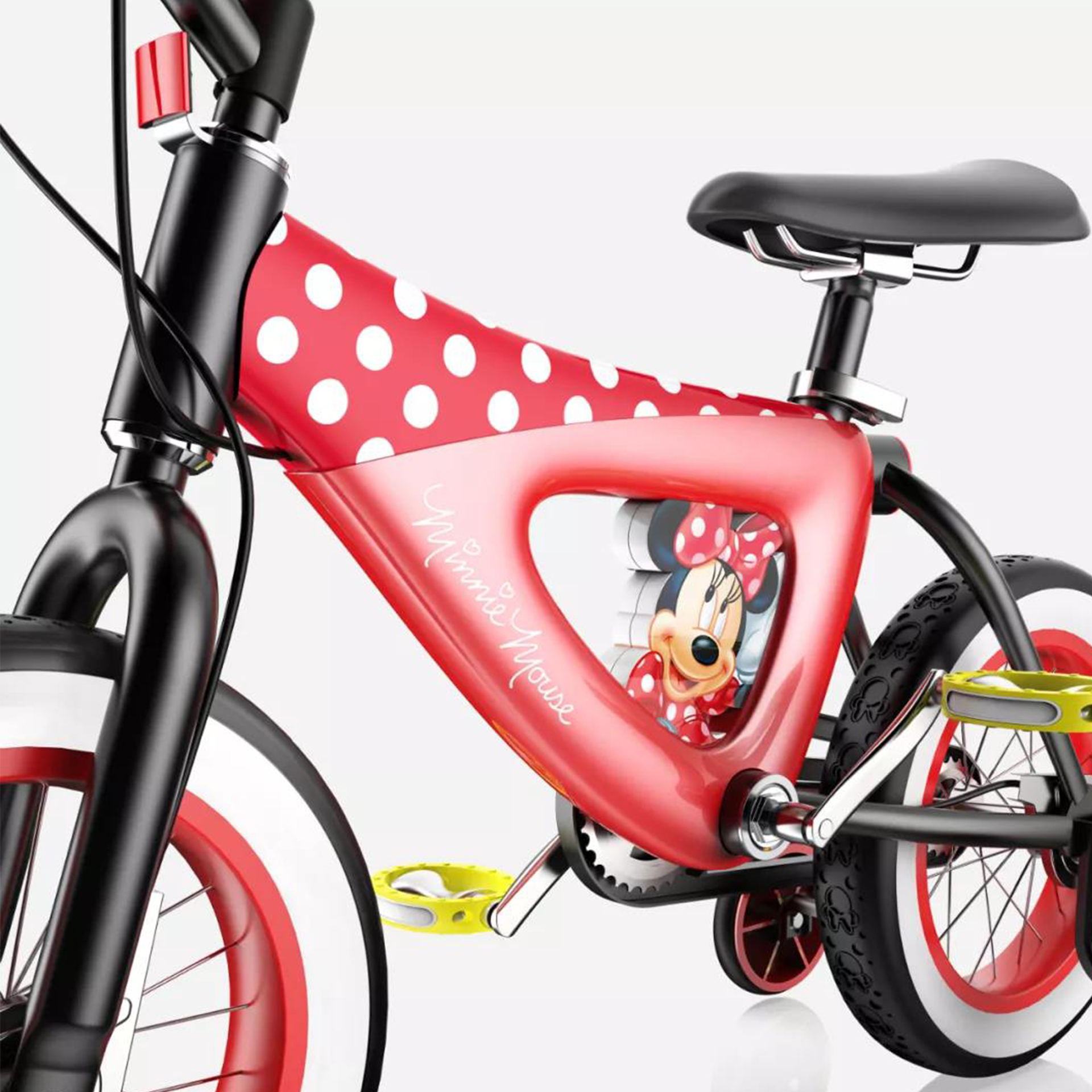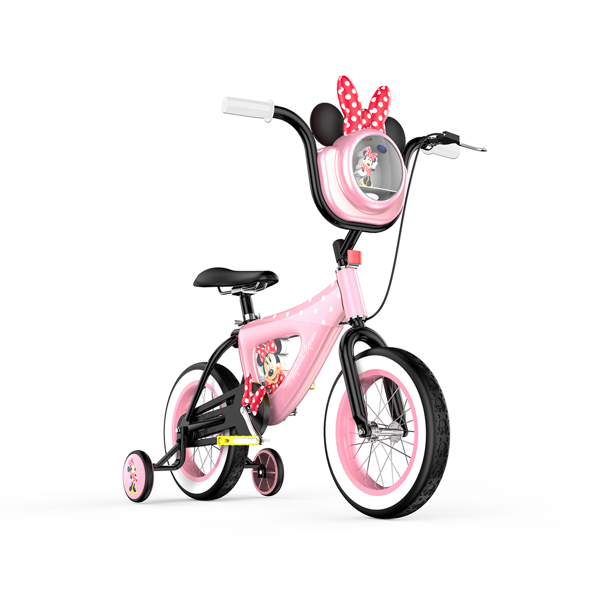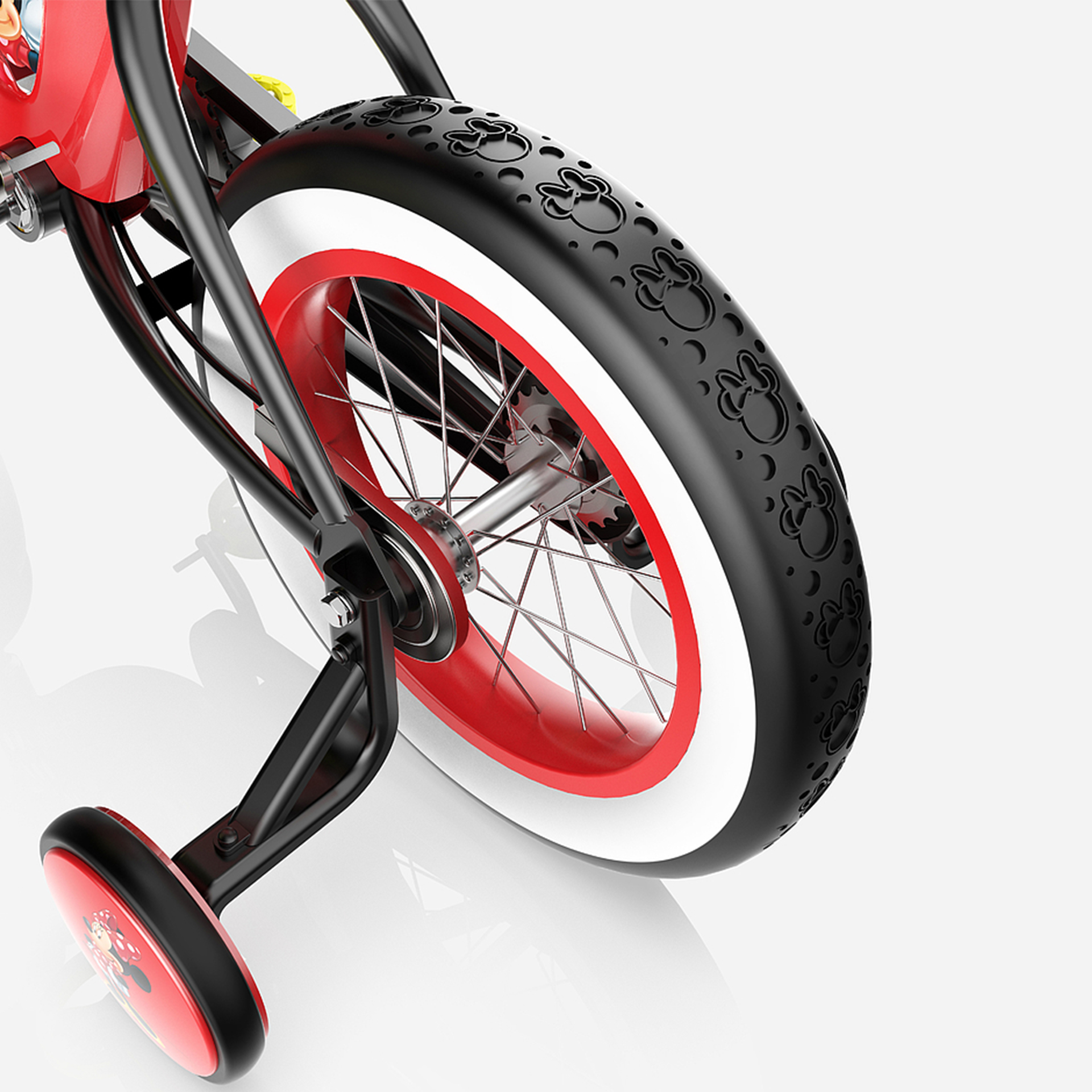 輔助輪與車架中部印有米妮肖像圖案,象征米妮始終陪隨在孩子左右,車胎印有米妮老鼠頭像紋理,象征米妮與孩子一路同行、共同成長(zhǎng).