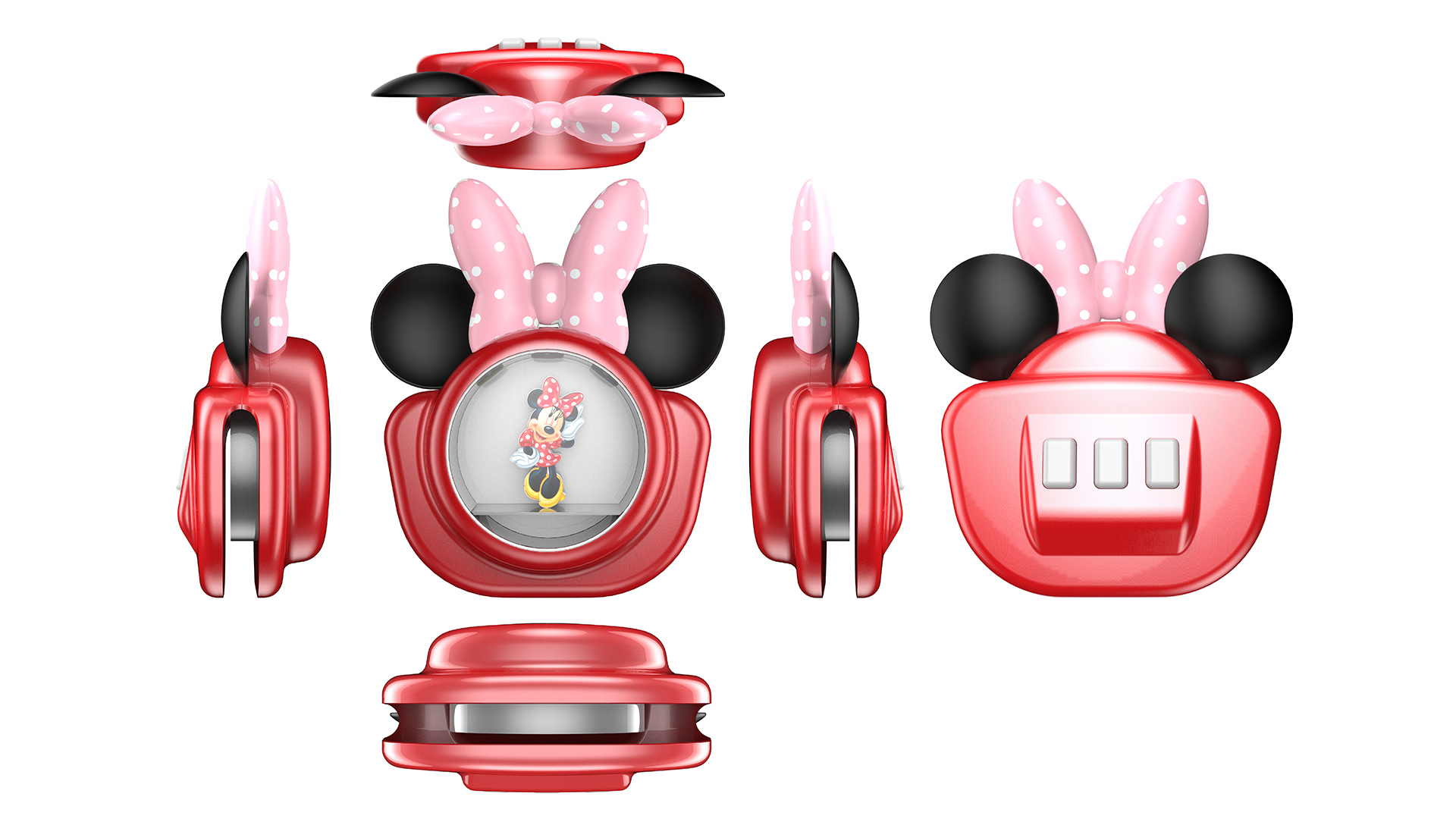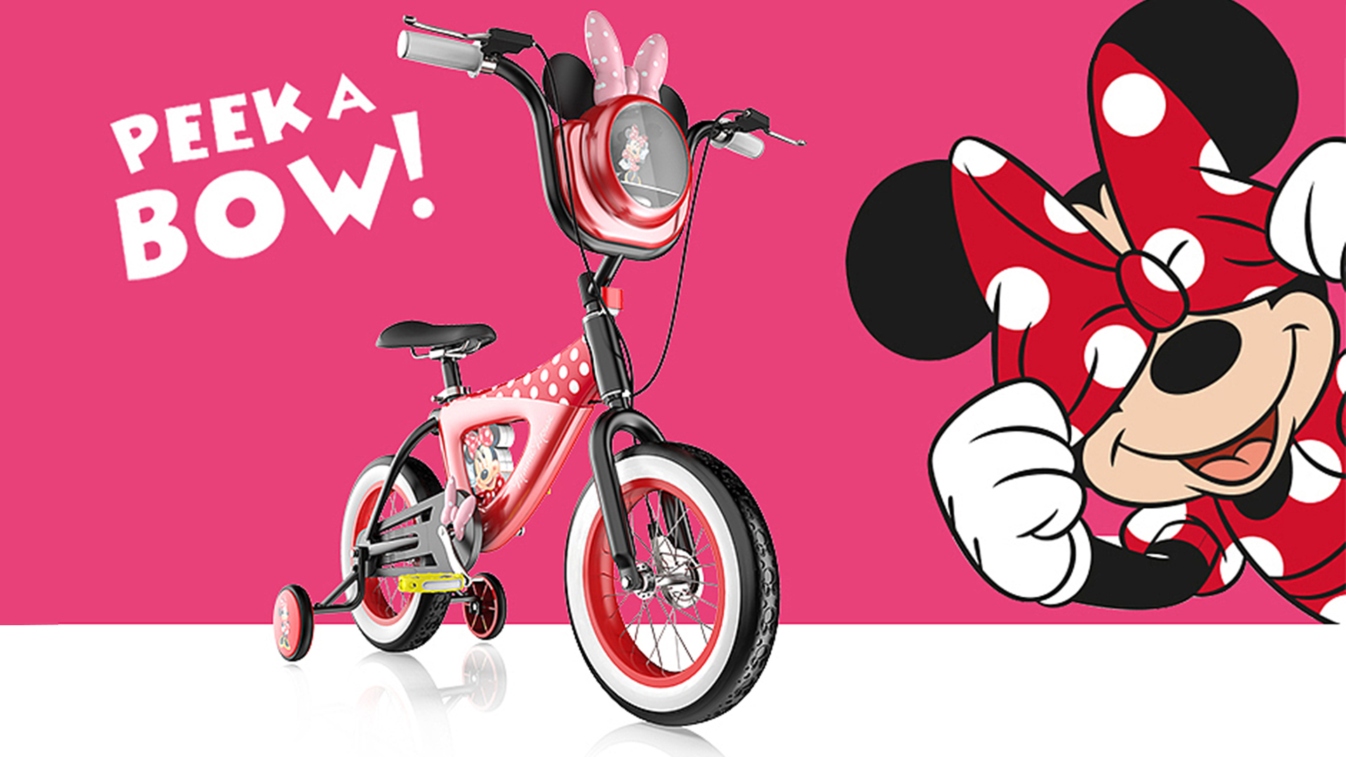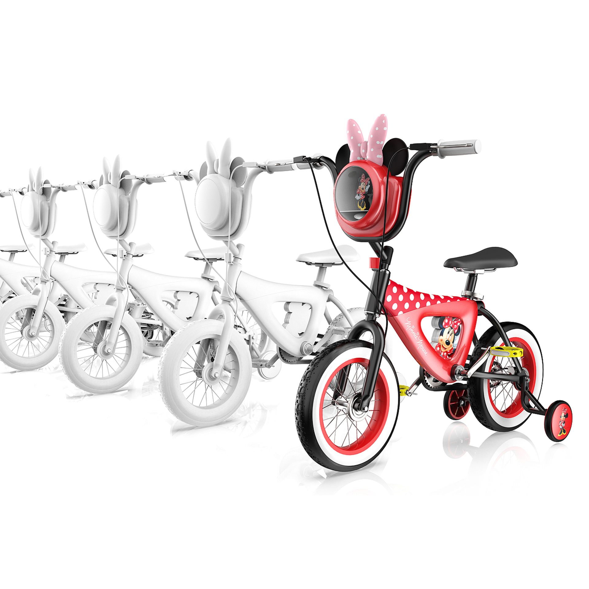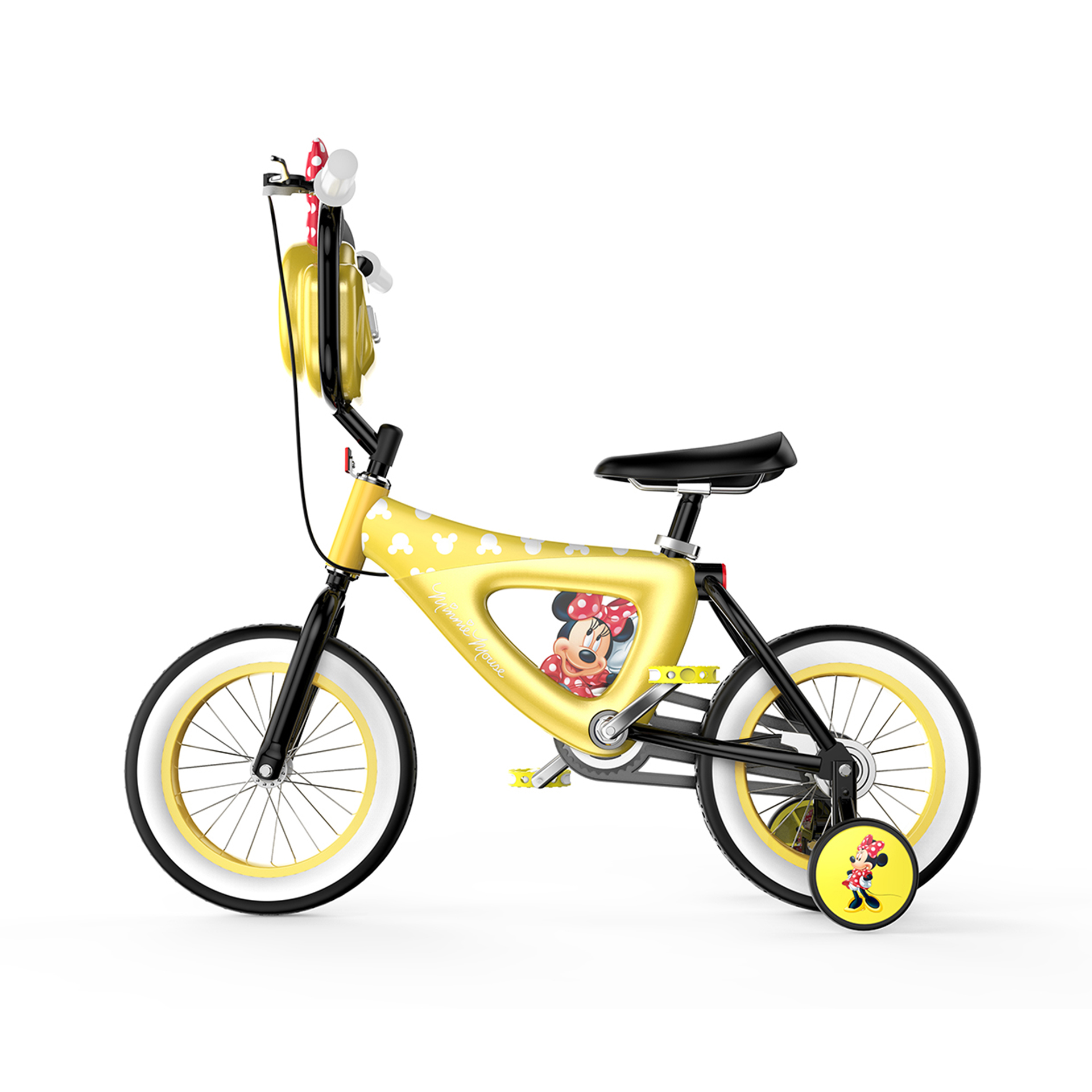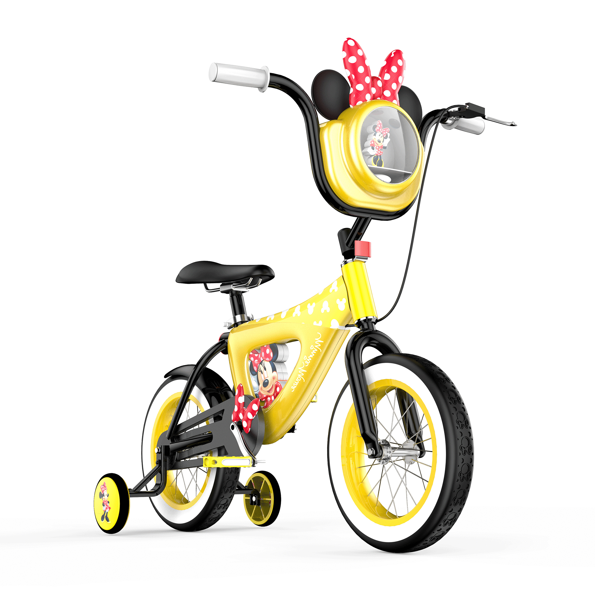 輔助輪與車架中部印有米妮肖像圖案,象征米妮始終陪隨在孩子左右,車胎印有米妮老鼠頭像紋理,象征米妮與孩子一路同行、共同成長(zhǎng).
