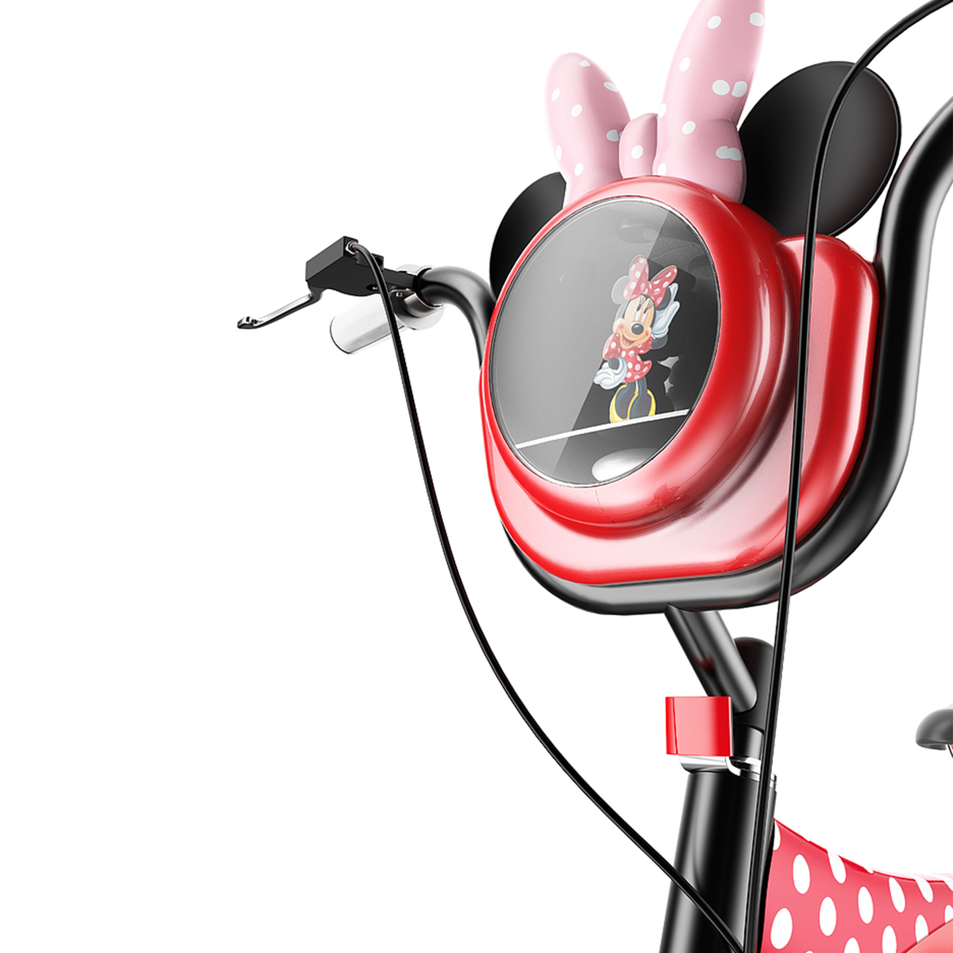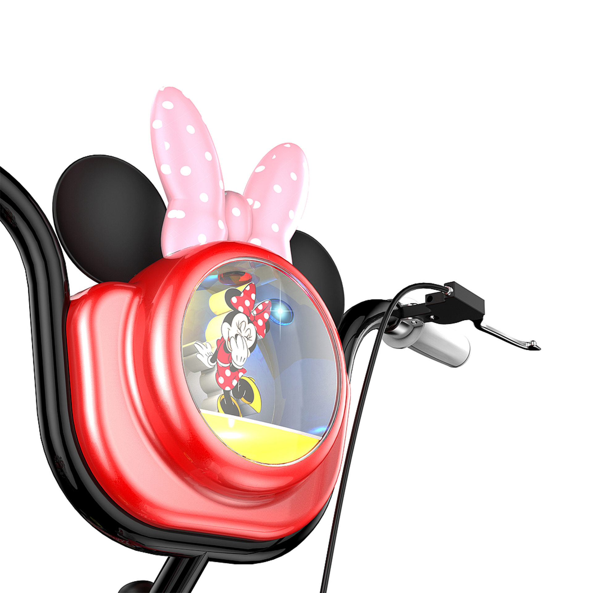 黑色車把手大弧度彎曲伸展,象征米妮溫柔的雙手帶領(lǐng)孩子奔向遠(yuǎn)方,中間半透明娃娃盒可存放零食或洋娃娃隨時(shí)隨地滿足孩子貪吃愛玩的需要,娃娃盒上面是米奇的兩只圓耳朵和蝴蝶結(jié)飾品讓米妮形象更生動(dòng)具體的體現(xiàn)在自行車中