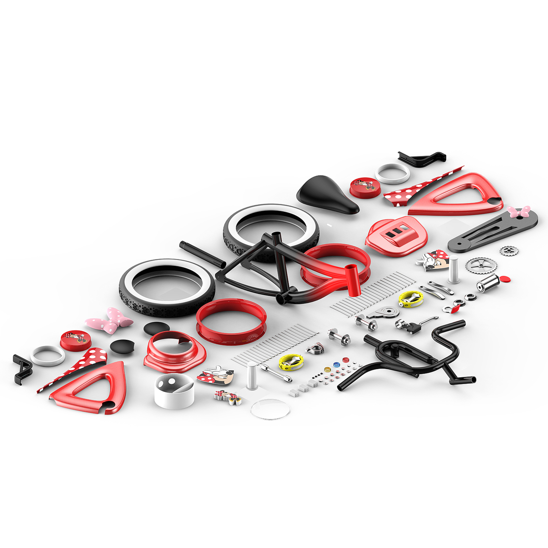 呼應(yīng)米妮充滿童趣的卡通形象,車架設(shè)計(jì)成飽滿有機(jī)的形態(tài),迎合孩子們喜歡的親和可愛風(fēng)格,配以紅色及白斑點(diǎn)紋理,象征米妮的紅色連衣裙,讓米妮形象融入車體的造型中,三角形穩(wěn)固設(shè)計(jì),為孩子騎行安全多添一份保障。